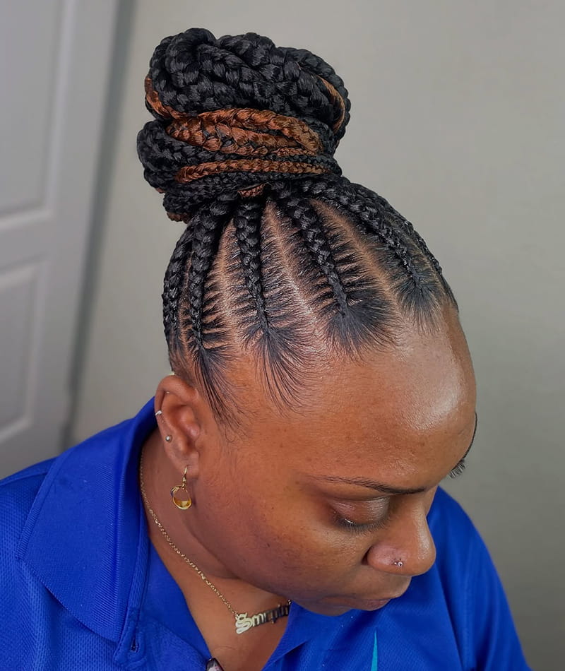 Koroba braids are a special Ghanaian pattern with thick and detailed swirls and raised sections. Additionally, they often end in a braided bun at the crown or back. This intricate look suits the confident and fashion-forward personalities. Besides, it can work on all face shapes, but is particularly flattering on round or oval faces since it adds height and structure. Koroba braids typically look striking on medium to dark skin tones. Due to their complexity, you can expect $100–$150+ for Koroba cornrow braids.