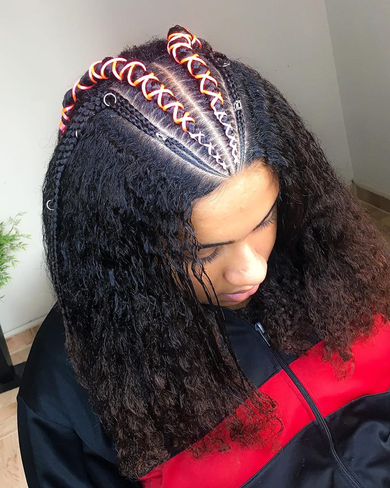 Ready to add a playful twist? Introducing criss-cross rubber bands into your braids can be a game-changer. It’s like sprinkling a little bit of fun into your hairstyle. This style is perfect for when you want to make a statement without going overboard. It’s especially great for younger folks or anyone young at heart! Plus, you can match the rubber bands to your outfit, making it a customizable style.