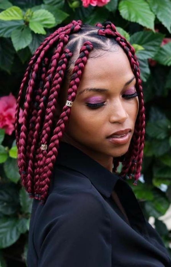 Burgundy box braids is a variant of box braids where the burgundy color is added to the braids.